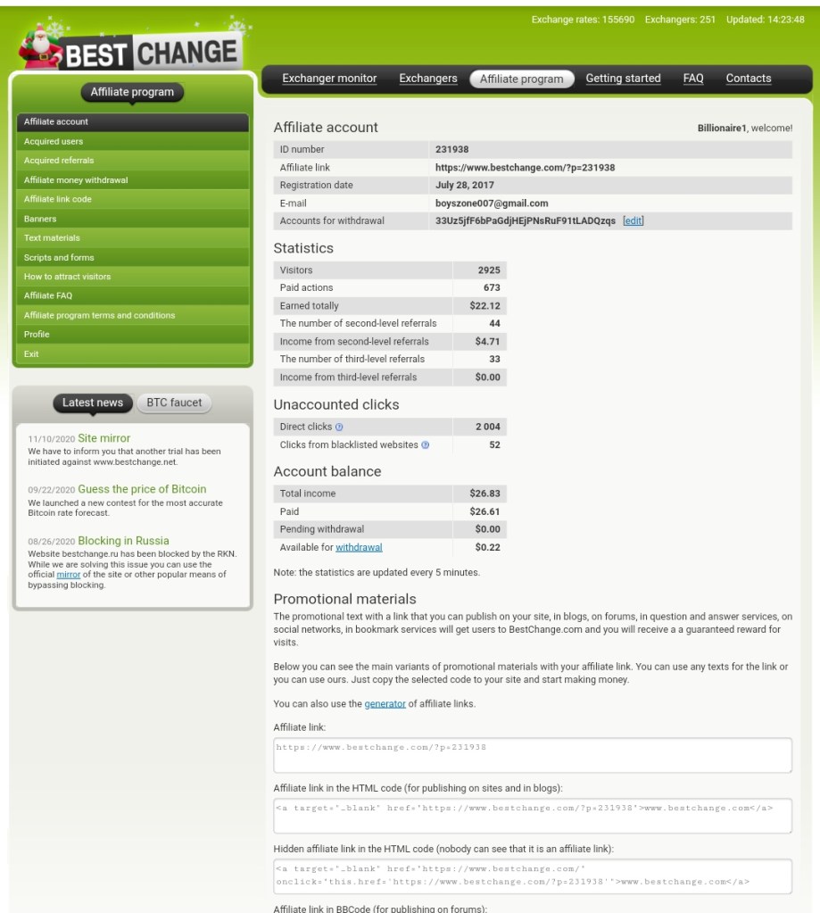💰🔥Bestchange: is cryptocurrencies exchange, you can exchange your coins and earn affiliate income for promoting your referral link clicks. For every click you will get paid $0.04, so if you have 250 clicks per day, you can earn $10 daily.