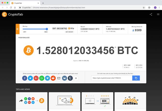 Boost your Bitcoin income Share the link to CryptoTab with your friends and get extra earnings in BTC depending on their earnings. The more you and your friends invite – the more you earn! Be proactive and make thousands of USD! Copy your personal link by plugin and share it across Facebook, Youtube, Twitter, Forums, and etc.