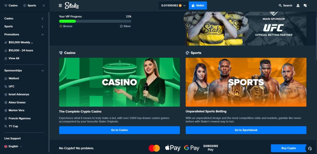 Stake is the one of the largest casinos in the world which is based in Curacao. With thousands of different slot machines and every table game known to mankind, Stake rewards this their loyal players with VIP bonuses that start when a player hits Bronze. On top of that, the sportsbook on Stake.com is one of a kind with multiple in-play markets on any sport imaginable. Due to the fact that Stake does not accept fiat currency, the deposits and withdrawals are lightning quick when using Bitcoin, Ethereum, Ripple, Litecoin and a few other cryptocurrency coins.